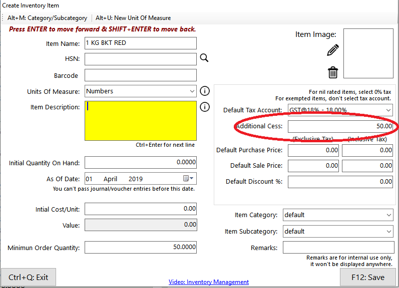 (When you define the Additional Cess, it will add the Cess amount in the Taxable value but will not reflect the same in the Voucher.)