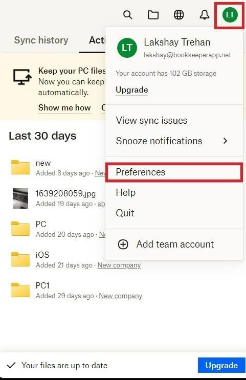 2. As soon as Dropbox will open, click your avatar (profile picture or initials) in the top-right corner and after clicking the Avatar as depicted in the below window, click on preferences.