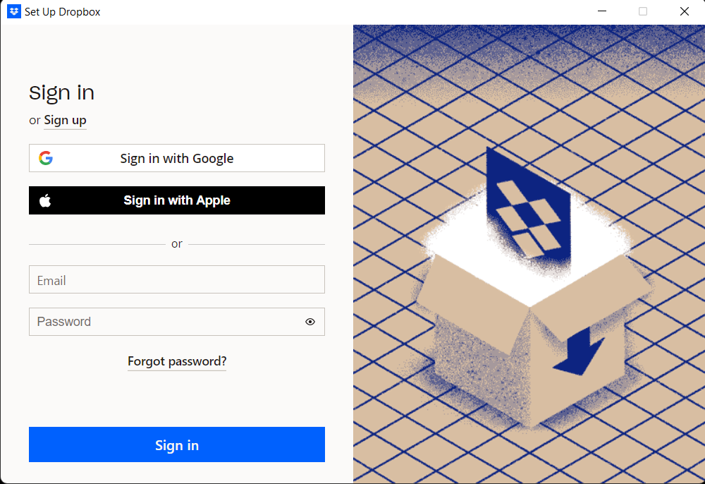 4. After signing out from the window, open the dropbox app again and it will ask you to sign in.