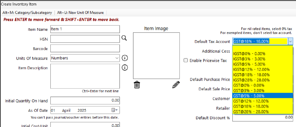 For example, the vouchers created with GST@18% will remain at 18% tax rate. After updating the tax account to GST@5% in Items, the new vouchers will take 5% tax slab.