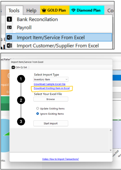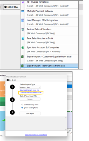 Go to Gold plan on top > Click on Export Items/Services from Excel. (Make sure you have Gold plan, then you can access this feature)