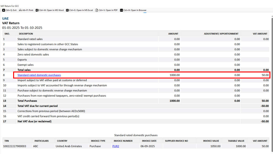 When you check the VAT Return for GCC report, the transaction will be accurately classified under the "Standard rated domestic purchases" section.