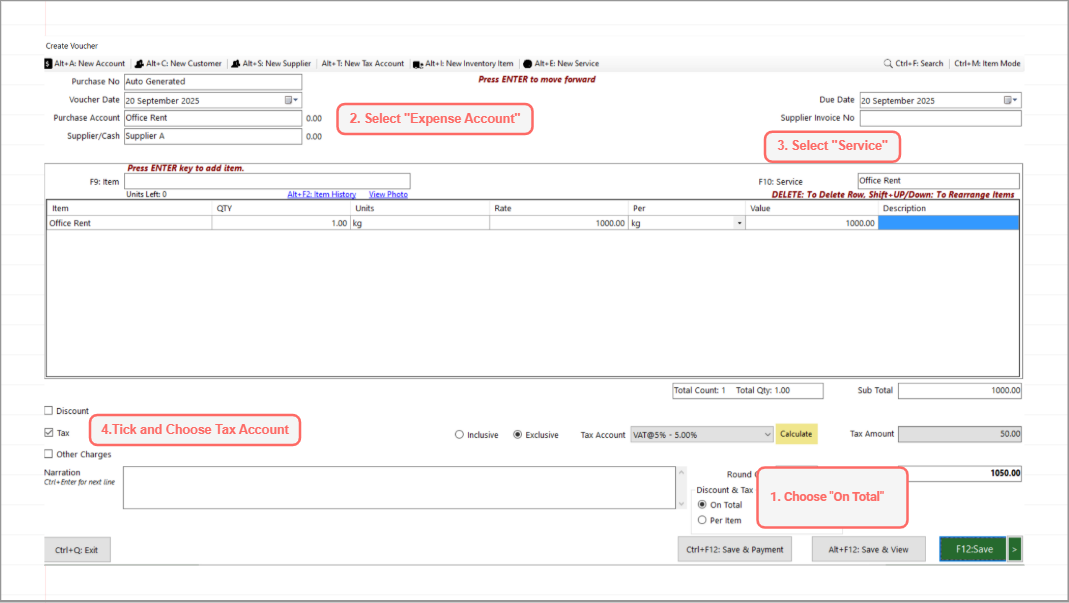 In the Tax Account field, select the relevant tax ledger (e.g., VAT@5%) and enter the tax amount.